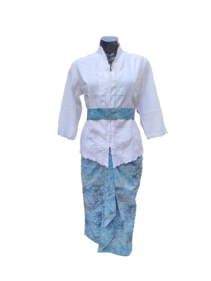Elegant Balinese traditional outfit with white kebaya and blue batik kain ideal for ceremonies, cultural events, or display.